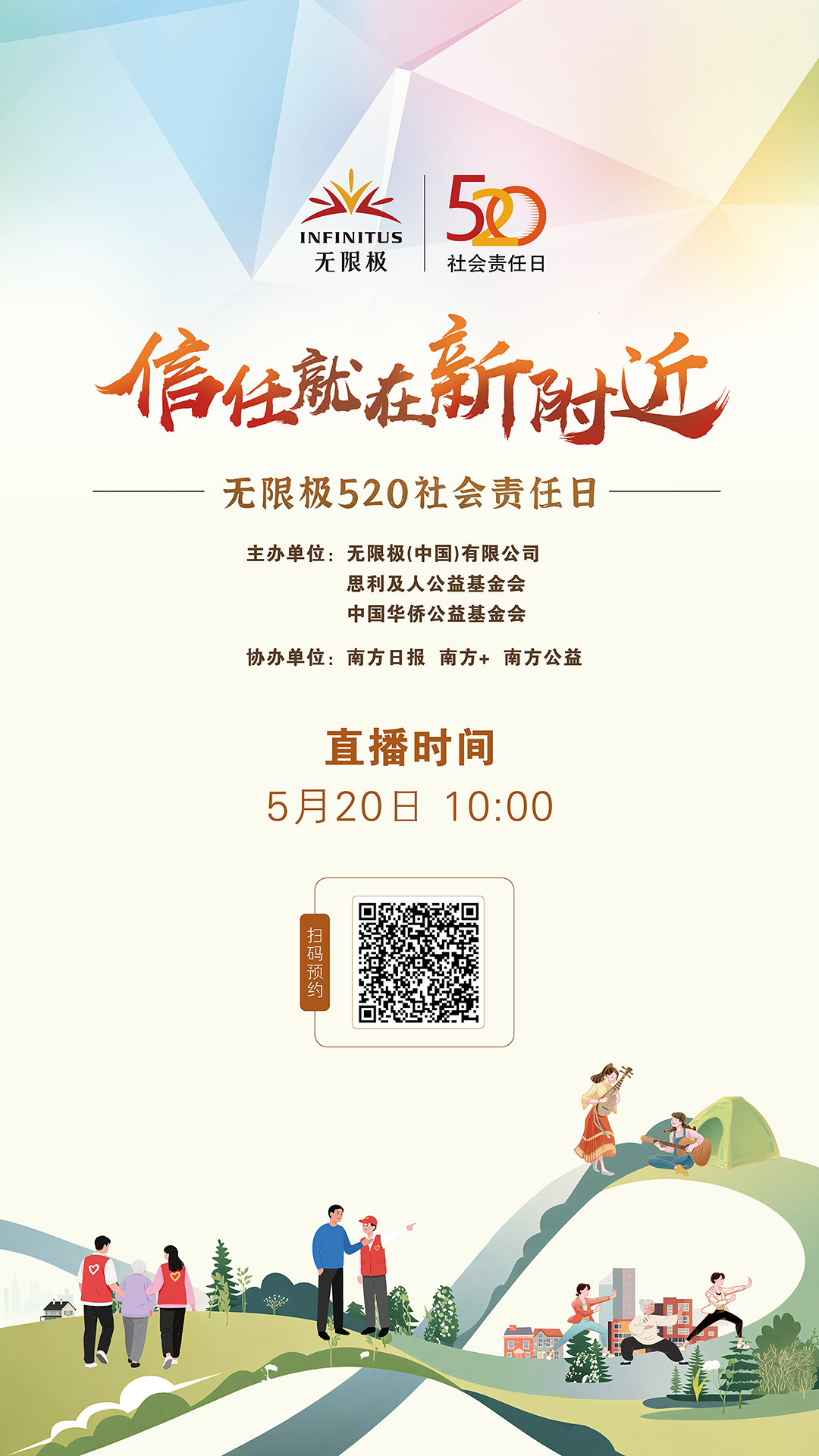 从2019年开始,无限极将每年5月20日定为社会责任日,举办无限极“520社会责任日”活动,号召社会各界一起关注和践行社会责任。今年,我们以“信任就在新附近”为主题,呼吁更多企业和个人从身边开始重建信任。我们还将联动无限极线下门店、员工、创业合伙人、志愿者队伍,一起在社区开展以信任构建为出发点的公益志愿活动,与广大民众一起“再造新附近”,通过在身边、更温暖、可持续的连接,找回曾经熟悉的“信任感”和正在消失的“附近”。